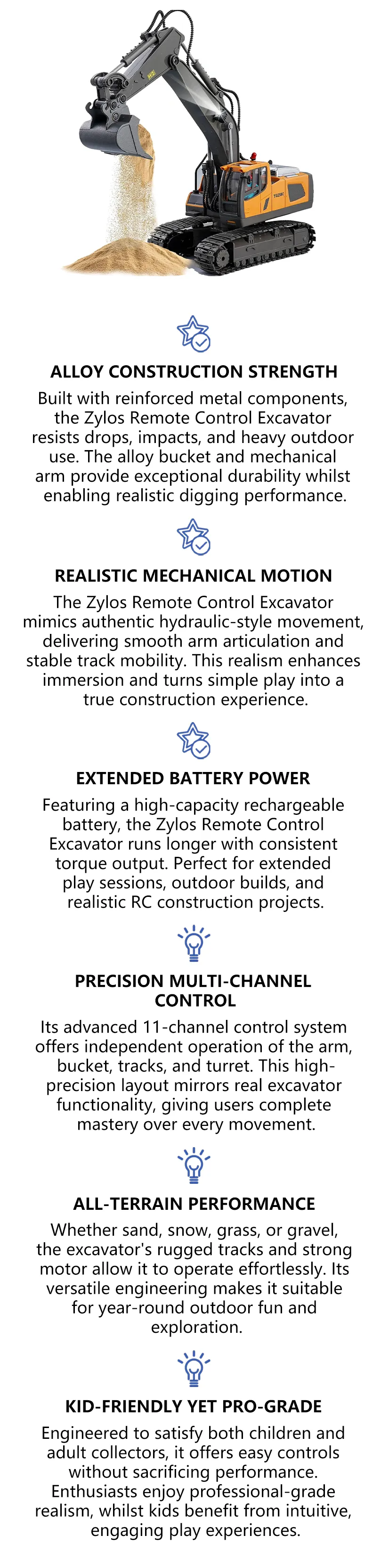 - Multi-Channel Control – More realistic and fun with digging, lifting, and rotation actions.